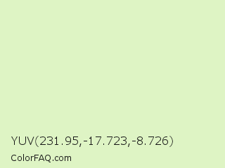 YUV 231.95,-17.723,-8.726 Color is a very light green color and the nearest color is Tea Green #d0f0c0. Hex code #def4c4 and RGB value is rgb(222,244,196). In RGB color space, this color is composed of 87% red, 96% green, 77% blue, In CMYK color space, this color is composed of 9% cyan, 0% magenta, 20% yellow , 4% black , In HSL color space, this color has a hue angle of 88° , 69% saturation and 86% lightness.