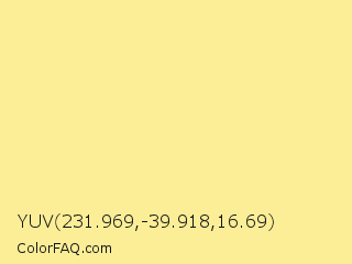 YUV 231.969,-39.918,16.69 Color is a light yellow color and the nearest color is Picasso #fff39d. Hex code #fbee97 and RGB value is rgb(251,238,151). In RGB color space, this color is composed of 98% red, 93% green, 59% blue, In CMYK color space, this color is composed of 0% cyan, 5% magenta, 40% yellow , 2% black , In HSL color space, this color has a hue angle of 52° , 93% saturation and 79% lightness.