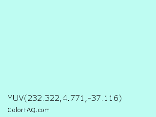 YUV 232.322,4.771,-37.116 Color is a very light cyan color and the nearest color is Mint Tulip #c4f4eb. Hex code #befcf2 and RGB value is rgb(190,252,242). In RGB color space, this color is composed of 75% red, 99% green, 95% blue, In CMYK color space, this color is composed of 25% cyan, 0% magenta, 4% yellow , 1% black , In HSL color space, this color has a hue angle of 170° , 91% saturation and 87% lightness.