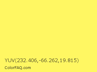 YUV 232.406,-66.262,19.815 Color is a light yellow color and the nearest color is Icterine #fcf75e. Hex code #fff762 and RGB value is rgb(255,247,98). In RGB color space, this color is composed of 100% red, 97% green, 38% blue, In CMYK color space, this color is composed of 0% cyan, 3% magenta, 62% yellow , 0% black , In HSL color space, this color has a hue angle of 57° , 100% saturation and 69% lightness.