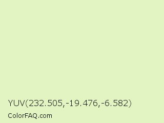 YUV 232.505,-19.476,-6.582 Color is a very light green color and the nearest color is Tusk #eef3c3. Hex code #e1f4c1 and RGB value is rgb(225,244,193). In RGB color space, this color is composed of 88% red, 96% green, 76% blue, In CMYK color space, this color is composed of 8% cyan, 0% magenta, 21% yellow , 4% black , In HSL color space, this color has a hue angle of 82° , 70% saturation and 86% lightness.