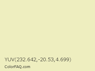 YUV 232.642,-20.53,4.699 Color is a very light yellow color and the nearest color is Mint Julep #f1eec1. Hex code #eeeebf and RGB value is rgb(238,238,191). In RGB color space, this color is composed of 93% red, 93% green, 75% blue, In CMYK color space, this color is composed of 0% cyan, 0% magenta, 20% yellow , 7% black , In HSL color space, this color has a hue angle of 60° , 58% saturation and 84% lightness.