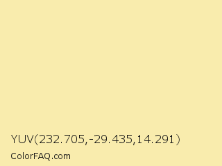 YUV 232.705,-29.435,14.291 Color is a very light yellow color and the nearest color is Banana Mania Crayola #fbe7b2. Hex code #f9ecad and RGB value is rgb(249,236,173). In RGB color space, this color is composed of 98% red, 93% green, 68% blue, In CMYK color space, this color is composed of 0% cyan, 5% magenta, 31% yellow , 2% black , In HSL color space, this color has a hue angle of 50° , 86% saturation and 83% lightness.