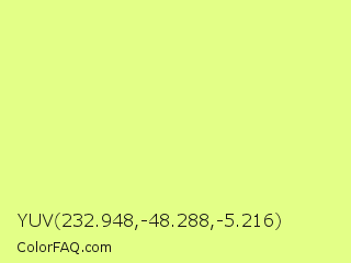 YUV 232.948,-48.288,-5.216 Color is a light lime color and the nearest color is Mindaro #e3f988. Hex code #e3ff87 and RGB value is rgb(227,255,135). In RGB color space, this color is composed of 89% red, 100% green, 53% blue, In CMYK color space, this color is composed of 11% cyan, 0% magenta, 47% yellow , 0% black , In HSL color space, this color has a hue angle of 74° , 100% saturation and 76% lightness.