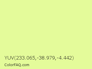 YUV 233.065,-38.979,-4.442 Color is a light lime color and the nearest color is Jonquil #eeff9a. Hex code #e4fb9a and RGB value is rgb(228,251,154). In RGB color space, this color is composed of 89% red, 98% green, 60% blue, In CMYK color space, this color is composed of 9% cyan, 0% magenta, 39% yellow , 2% black , In HSL color space, this color has a hue angle of 74° , 92% saturation and 79% lightness.