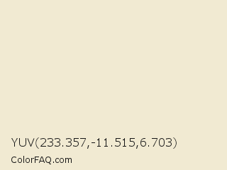 YUV 233.357,-11.515,6.703 Color is a very light yellow color and the nearest color is Parchment #f1e9d2. Hex code #f1ead2 and RGB value is rgb(241,234,210). In RGB color space, this color is composed of 95% red, 92% green, 82% blue, In CMYK color space, this color is composed of 0% cyan, 3% magenta, 13% yellow , 5% black , In HSL color space, this color has a hue angle of 46° , 53% saturation and 88% lightness.