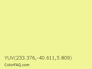 YUV 233.376,-40.611,5.809 Color is a light yellow color and the nearest color is Jonquil #eeff9a. Hex code #f0f697 and RGB value is rgb(240,246,151). In RGB color space, this color is composed of 94% red, 96% green, 59% blue, In CMYK color space, this color is composed of 2% cyan, 0% magenta, 39% yellow , 4% black , In HSL color space, this color has a hue angle of 64° , 84% saturation and 78% lightness.