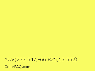 YUV 233.547,-66.825,13.552 Color is a light yellow color and the nearest color is Canary #f3fb62. Hex code #f9fc62 and RGB value is rgb(249,252,98). In RGB color space, this color is composed of 98% red, 99% green, 38% blue, In CMYK color space, this color is composed of 1% cyan, 0% magenta, 61% yellow , 1% black , In HSL color space, this color has a hue angle of 61° , 96% saturation and 69% lightness.
