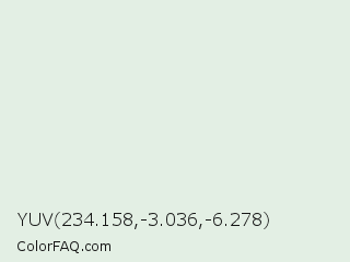 YUV 234.158,-3.036,-6.278 Color is a very light green color and the nearest color is Gray Nurse #e7ece6. Hex code #e3efe4 and RGB value is rgb(227,239,228). In RGB color space, this color is composed of 89% red, 94% green, 89% blue, In CMYK color space, this color is composed of 5% cyan, 0% magenta, 5% yellow , 6% black , In HSL color space, this color has a hue angle of 125° , 27% saturation and 91% lightness.