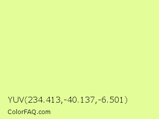 YUV 234.413,-40.137,-6.501 Color is a light lime color and the nearest color is Jonquil #eeff9a. Hex code #e3fe99 and RGB value is rgb(227,254,153). In RGB color space, this color is composed of 89% red, 100% green, 60% blue, In CMYK color space, this color is composed of 11% cyan, 0% magenta, 40% yellow , 0% black , In HSL color space, this color has a hue angle of 76° , 98% saturation and 80% lightness.