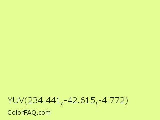 YUV 234.441,-42.615,-4.772 Color is a light lime color and the nearest color is Jonquil #eeff9a. Hex code #e5fe94 and RGB value is rgb(229,254,148). In RGB color space, this color is composed of 90% red, 100% green, 58% blue, In CMYK color space, this color is composed of 10% cyan, 0% magenta, 42% yellow , 0% black , In HSL color space, this color has a hue angle of 74° , 98% saturation and 79% lightness.
