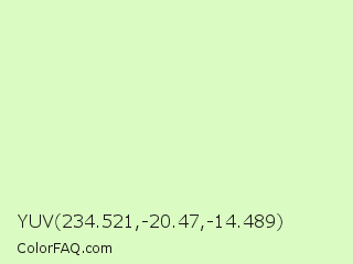 YUV 234.521,-20.47,-14.489 Color is a very light green color and the nearest color is Tea Green #d0f0c0. Hex code #dafbc1 and RGB value is rgb(218,251,193). In RGB color space, this color is composed of 85% red, 98% green, 76% blue, In CMYK color space, this color is composed of 13% cyan, 0% magenta, 23% yellow , 2% black , In HSL color space, this color has a hue angle of 94° , 88% saturation and 87% lightness.