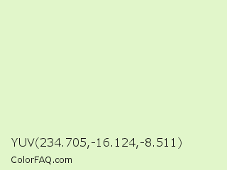 YUV 234.705,-16.124,-8.511 Color is a very light green color and the nearest color is Snow Flurry #e4ffd1. Hex code #e1f6ca and RGB value is rgb(225,246,202). In RGB color space, this color is composed of 88% red, 96% green, 79% blue, In CMYK color space, this color is composed of 9% cyan, 0% magenta, 18% yellow , 4% black , In HSL color space, this color has a hue angle of 89° , 71% saturation and 88% lightness.