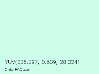 YUV 236.297,-0.639,-28.324 Color is a very light green color and the nearest color is Aero Blue #c9ffe5. Hex code #ccfdeb and RGB value is rgb(204,253,235). In RGB color space, this color is composed of 80% red, 99% green, 92% blue, In CMYK color space, this color is composed of 19% cyan, 0% magenta, 7% yellow , 1% black , In HSL color space, this color has a hue angle of 158° , 92% saturation and 90% lightness.