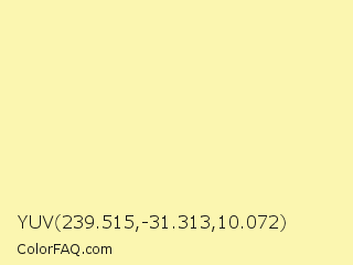 YUV 239.515,-31.313,10.072 Color is a very light yellow color and the nearest color is Drover #fdf7ad. Hex code #fbf6b0 and RGB value is rgb(251,246,176). In RGB color space, this color is composed of 98% red, 96% green, 69% blue, In CMYK color space, this color is composed of 0% cyan, 2% magenta, 30% yellow , 2% black , In HSL color space, this color has a hue angle of 56° , 90% saturation and 84% lightness.