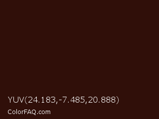 YUV 24.183,-7.485,20.888 Color is a very dark red color and the nearest color is Zinnwaldite Brown #2c1608. Hex code #300f09 and RGB value is rgb(48,15,9). In RGB color space, this color is composed of 19% red, 6% green, 4% blue, In CMYK color space, this color is composed of 0% cyan, 69% magenta, 81% yellow , 81% black , In HSL color space, this color has a hue angle of 9° , 68% saturation and 11% lightness.