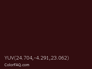 YUV 24.704,-4.291,23.062 Color is a very dark red color and the nearest color is Aubergine #3b0910. Hex code #330d10 and RGB value is rgb(51,13,16). In RGB color space, this color is composed of 20% red, 5% green, 6% blue, In CMYK color space, this color is composed of 0% cyan, 75% magenta, 69% yellow , 80% black , In HSL color space, this color has a hue angle of 355° , 59% saturation and 13% lightness.