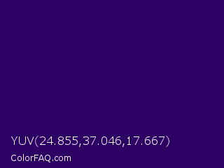 YUV 24.855,37.046,17.667 Color is a very dark violet color and the nearest color is Deep Violet #330066. Hex code #2d0064 and RGB value is rgb(45,-0,100). In RGB color space, this color is composed of 18% red, 0% green, 39% blue, In CMYK color space, this color is composed of 55% cyan, 100% magenta, 0% yellow , 61% black , In HSL color space, this color has a hue angle of 267° , 100% saturation and 20% lightness.