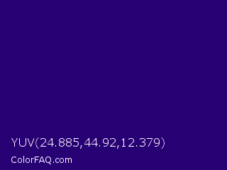 YUV 24.885,44.92,12.379 Color is a dark indigo color and the nearest color is Deep Blue #220878. Hex code #270074 and RGB value is rgb(39,-0,116). In RGB color space, this color is composed of 15% red, 0% green, 45% blue, In CMYK color space, this color is composed of 66% cyan, 100% magenta, 0% yellow , 55% black , In HSL color space, this color has a hue angle of 260° , 100% saturation and 23% lightness.