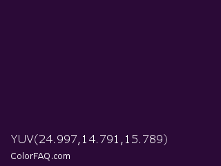 YUV 24.997,14.791,15.789 Color is a very dark purple color and the nearest color is Violet #240a40. Hex code #2b0a37 and RGB value is rgb(43,10,55). In RGB color space, this color is composed of 17% red, 4% green, 22% blue, In CMYK color space, this color is composed of 22% cyan, 82% magenta, 0% yellow , 78% black , In HSL color space, this color has a hue angle of 284° , 69% saturation and 13% lightness.
