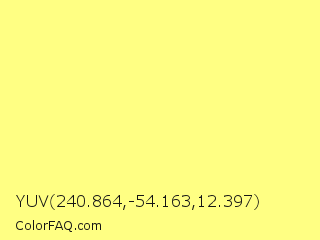 YUV 240.864,-54.163,12.397 Color is a light yellow color and the nearest color is Dolly #f9ff8b. Hex code #ffff83 and RGB value is rgb(255,255,131). In RGB color space, this color is composed of 100% red, 100% green, 51% blue, In CMYK color space, this color is composed of 0% cyan, 0% magenta, 49% yellow , 0% black , In HSL color space, this color has a hue angle of 60° , 100% saturation and 76% lightness.