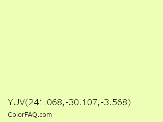 YUV 241.068,-30.107,-3.568 Color is a very light lime color and the nearest color is Tidal #f1ffad. Hex code #edffb4 and RGB value is rgb(237,255,180). In RGB color space, this color is composed of 93% red, 100% green, 71% blue, In CMYK color space, this color is composed of 7% cyan, 0% magenta, 29% yellow , 0% black , In HSL color space, this color has a hue angle of 74° , 100% saturation and 85% lightness.