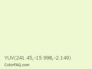 YUV 241.45,-15.998,-2.149 Color is a very light lime color and the nearest color is Orinoco #f3fbd4. Hex code #eff9d1 and RGB value is rgb(239,249,209). In RGB color space, this color is composed of 94% red, 98% green, 82% blue, In CMYK color space, this color is composed of 4% cyan, 0% magenta, 16% yellow , 2% black , In HSL color space, this color has a hue angle of 75° , 77% saturation and 90% lightness.