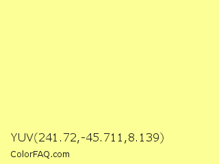 YUV 241.72,-45.711,8.139 Color is a light yellow color and the nearest color is Pastel Yellow #fdfd96. Hex code #fbff95 and RGB value is rgb(251,255,149). In RGB color space, this color is composed of 98% red, 100% green, 58% blue, In CMYK color space, this color is composed of 2% cyan, 0% magenta, 42% yellow , 0% black , In HSL color space, this color has a hue angle of 62° , 100% saturation and 79% lightness.