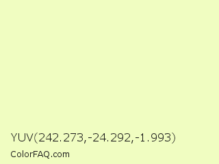 YUV 242.273,-24.292,-1.993 Color is a very light lime color and the nearest color is Australian Mint #f5ffbe. Hex code #f0fdc1 and RGB value is rgb(240,253,193). In RGB color space, this color is composed of 94% red, 99% green, 76% blue, In CMYK color space, this color is composed of 5% cyan, 0% magenta, 24% yellow , 1% black , In HSL color space, this color has a hue angle of 73° , 94% saturation and 87% lightness.