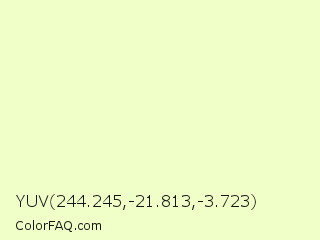 YUV 244.245,-21.813,-3.723 Color is a very light lime color and the nearest color is Chiffon #f1ffc8. Hex code #f0ffc8 and RGB value is rgb(240,255,200). In RGB color space, this color is composed of 94% red, 100% green, 78% blue, In CMYK color space, this color is composed of 6% cyan, 0% magenta, 22% yellow , 0% black , In HSL color space, this color has a hue angle of 76° , 100% saturation and 89% lightness.