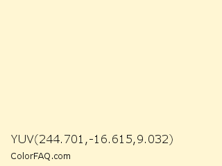 YUV 244.701,-16.615,9.032 Color is a very light yellow color and the nearest color is Milk Punch #fff6d4. Hex code #fff6d3 and RGB value is rgb(255,246,211). In RGB color space, this color is composed of 100% red, 96% green, 83% blue, In CMYK color space, this color is composed of 0% cyan, 4% magenta, 17% yellow , 0% black , In HSL color space, this color has a hue angle of 48° , 100% saturation and 91% lightness.