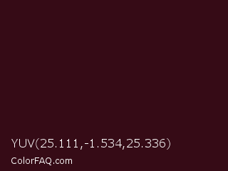 YUV 25.111,-1.534,25.336 Color is a very dark red color and the nearest color is Aubergine #3b0910. Hex code #360b16 and RGB value is rgb(54,11,22). In RGB color space, this color is composed of 21% red, 4% green, 9% blue, In CMYK color space, this color is composed of 0% cyan, 80% magenta, 59% yellow , 79% black , In HSL color space, this color has a hue angle of 345° , 66% saturation and 13% lightness.
