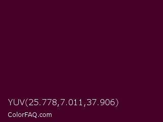 YUV 25.778,7.011,37.906 Color is a very dark magenta color and the nearest color is Barossa #44012d. Hex code #450128 and RGB value is rgb(69,1,40). In RGB color space, this color is composed of 27% red, 0% green, 16% blue, In CMYK color space, this color is composed of 0% cyan, 99% magenta, 42% yellow , 73% black , In HSL color space, this color has a hue angle of 326° , 97% saturation and 14% lightness.