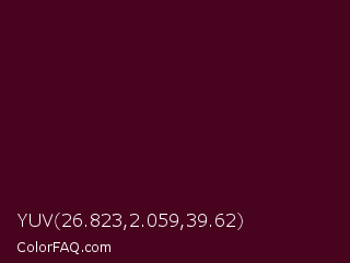 YUV 26.823,2.059,39.62 Color is a very dark rose color and the nearest color is Castro #52001f. Hex code #48031f and RGB value is rgb(72,3,31). In RGB color space, this color is composed of 28% red, 1% green, 12% blue, In CMYK color space, this color is composed of 0% cyan, 96% magenta, 57% yellow , 72% black , In HSL color space, this color has a hue angle of 336° , 92% saturation and 15% lightness.