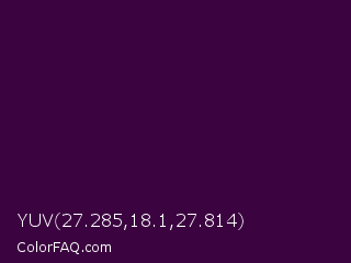 YUV 27.285,18.1,27.814 Color is a very dark magenta color and the nearest color is Valentino #350e42. Hex code #3b0440 and RGB value is rgb(59,4,64). In RGB color space, this color is composed of 23% red, 2% green, 25% blue, In CMYK color space, this color is composed of 8% cyan, 94% magenta, 0% yellow , 75% black , In HSL color space, this color has a hue angle of 295° , 88% saturation and 13% lightness.