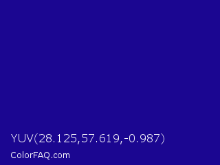 YUV 28.125,57.619,-0.987 Color is a dark indigo color and the nearest color is Ultramarine #120a8f. Hex code #1b0691 and RGB value is rgb(27,6,145). In RGB color space, this color is composed of 11% red, 2% green, 57% blue, In CMYK color space, this color is composed of 81% cyan, 96% magenta, 0% yellow , 43% black , In HSL color space, this color has a hue angle of 249° , 92% saturation and 30% lightness.