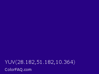 YUV 28.182,51.182,10.364 Color is a dark indigo color and the nearest color is Deep Blue #220878. Hex code #280284 and RGB value is rgb(40,2,132). In RGB color space, this color is composed of 16% red, 1% green, 52% blue, In CMYK color space, this color is composed of 70% cyan, 98% magenta, 0% yellow , 48% black , In HSL color space, this color has a hue angle of 258° , 97% saturation and 26% lightness.