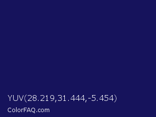 YUV 28.219,31.444,-5.454 Color is a very dark indigo color and the nearest color is Lucky Point #1a1a68. Hex code #16135c and RGB value is rgb(22,19,92). In RGB color space, this color is composed of 9% red, 7% green, 36% blue, In CMYK color space, this color is composed of 76% cyan, 79% magenta, 0% yellow , 64% black , In HSL color space, this color has a hue angle of 242° , 66% saturation and 22% lightness.
