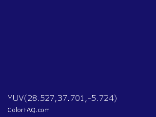 YUV 28.527,37.701,-5.724 Color is a dark indigo color and the nearest color is Arapawa #110c6c. Hex code #161169 and RGB value is rgb(22,17,105). In RGB color space, this color is composed of 9% red, 7% green, 41% blue, In CMYK color space, this color is composed of 79% cyan, 84% magenta, 0% yellow , 59% black , In HSL color space, this color has a hue angle of 243° , 72% saturation and 24% lightness.