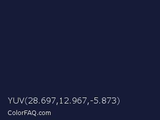 YUV 28.697,12.967,-5.873 Color is a very dark blue color and the nearest color is Haiti #1b1035. Hex code #161b37 and RGB value is rgb(22,27,55). In RGB color space, this color is composed of 9% red, 11% green, 22% blue, In CMYK color space, this color is composed of 60% cyan, 51% magenta, 0% yellow , 78% black , In HSL color space, this color has a hue angle of 231° , 43% saturation and 15% lightness.