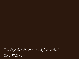 YUV 28.726,-7.753,13.395 Color is a very dark orange color and the nearest color is Coffee Bean #2a140e. Hex code #2c180d and RGB value is rgb(44,24,13). In RGB color space, this color is composed of 17% red, 9% green, 5% blue, In CMYK color space, this color is composed of 0% cyan, 45% magenta, 70% yellow , 83% black , In HSL color space, this color has a hue angle of 21° , 54% saturation and 11% lightness.