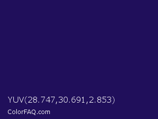 YUV 28.747,30.691,2.853 Color is a very dark indigo color and the nearest color is Violent Violet #290c5e. Hex code #200f5b and RGB value is rgb(32,15,91). In RGB color space, this color is composed of 13% red, 6% green, 36% blue, In CMYK color space, this color is composed of 65% cyan, 84% magenta, 0% yellow , 64% black , In HSL color space, this color has a hue angle of 253° , 72% saturation and 21% lightness.