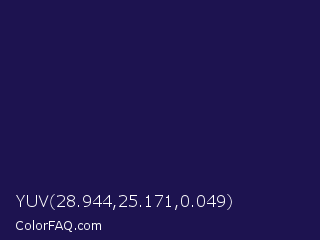 YUV 28.944,25.171,0.049 Color is a very dark indigo color and the nearest color is Port Gore #251f4f. Hex code #1d1350 and RGB value is rgb(29,19,80). In RGB color space, this color is composed of 11% red, 7% green, 31% blue, In CMYK color space, this color is composed of 64% cyan, 76% magenta, 0% yellow , 69% black , In HSL color space, this color has a hue angle of 250° , 62% saturation and 19% lightness.