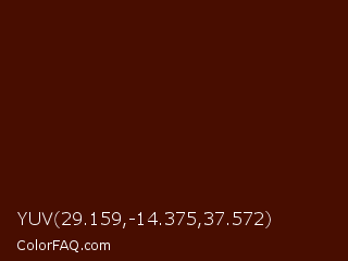 YUV 29.159,-14.375,37.572 Color is a very dark red color and the nearest color is Rustic Red #480404. Hex code #480d00 and RGB value is rgb(72,13,-0). In RGB color space, this color is composed of 28% red, 5% green, 0% blue, In CMYK color space, this color is composed of 0% cyan, 82% magenta, 100% yellow , 72% black , In HSL color space, this color has a hue angle of 11° , 100% saturation and 14% lightness.