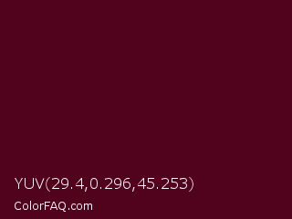 YUV 29.4,0.296,45.253 Color is a very dark rose color and the nearest color is Castro #52001f. Hex code #51031e and RGB value is rgb(81,3,30). In RGB color space, this color is composed of 32% red, 1% green, 12% blue, In CMYK color space, this color is composed of 0% cyan, 96% magenta, 63% yellow , 68% black , In HSL color space, this color has a hue angle of 339° , 93% saturation and 16% lightness.