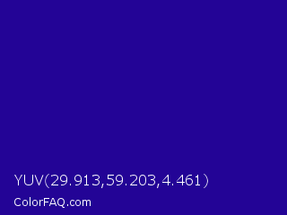 YUV 29.913,59.203,4.461 Color is a dark indigo color and the nearest color is Blue Gem #2c0e8c. Hex code #230496 and RGB value is rgb(35,4,150). In RGB color space, this color is composed of 14% red, 2% green, 59% blue, In CMYK color space, this color is composed of 77% cyan, 97% magenta, 0% yellow , 41% black , In HSL color space, this color has a hue angle of 253° , 95% saturation and 30% lightness.