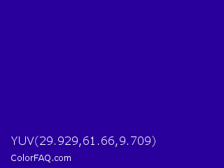 YUV 29.929,61.66,9.709 Color is a dark indigo color and the nearest color is Blue Gem #2c0e8c. Hex code #29009b and RGB value is rgb(41,-0,155). In RGB color space, this color is composed of 16% red, 0% green, 61% blue, In CMYK color space, this color is composed of 74% cyan, 100% magenta, 0% yellow , 39% black , In HSL color space, this color has a hue angle of 256° , 100% saturation and 30% lightness.
