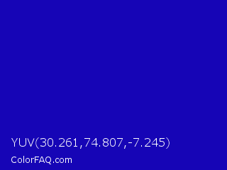 YUV 30.261,74.807,-7.245 Color is a normal indigo color and the nearest color is Dark Blue #0000c8. Hex code #1605b6 and RGB value is rgb(22,5,182). In RGB color space, this color is composed of 9% red, 2% green, 71% blue, In CMYK color space, this color is composed of 88% cyan, 97% magenta, 0% yellow , 29% black , In HSL color space, this color has a hue angle of 246° , 95% saturation and 37% lightness.