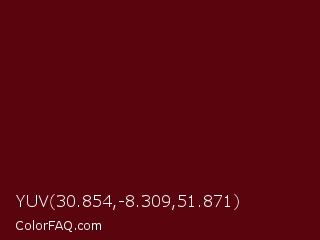 YUV 30.854,-8.309,51.871 Color is a very dark red color and the nearest color is Dark Scarlet #560319. Hex code #5a040e and RGB value is rgb(90,4,14). In RGB color space, this color is composed of 35% red, 2% green, 5% blue, In CMYK color space, this color is composed of 0% cyan, 96% magenta, 84% yellow , 65% black , In HSL color space, this color has a hue angle of 353° , 91% saturation and 18% lightness.