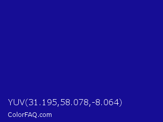 YUV 31.195,58.078,-8.064 Color is a normal indigo color and the nearest color is Ultramarine #120a8f. Hex code #160d95 and RGB value is rgb(22,13,149). In RGB color space, this color is composed of 9% red, 5% green, 58% blue, In CMYK color space, this color is composed of 85% cyan, 91% magenta, 0% yellow , 42% black , In HSL color space, this color has a hue angle of 244° , 84% saturation and 32% lightness.